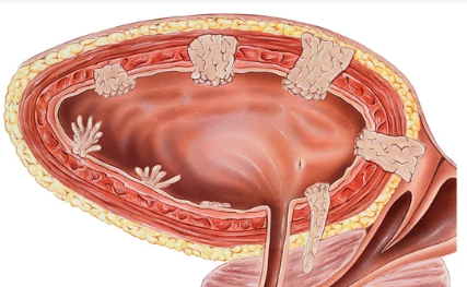 - 방광 점막에 생긴 종양이 요도 흐름을 방해하면
